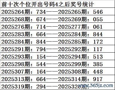 四、个位分析:上期开出号码4,前10次号码4出现之后下期同位号码为:6514273587,其中号码大小比为6:4,基本握平;奇偶比为6:4,基本稀奇;012路比为2:4:4,0路号码阐发相对较冷。本期参考号码:9。